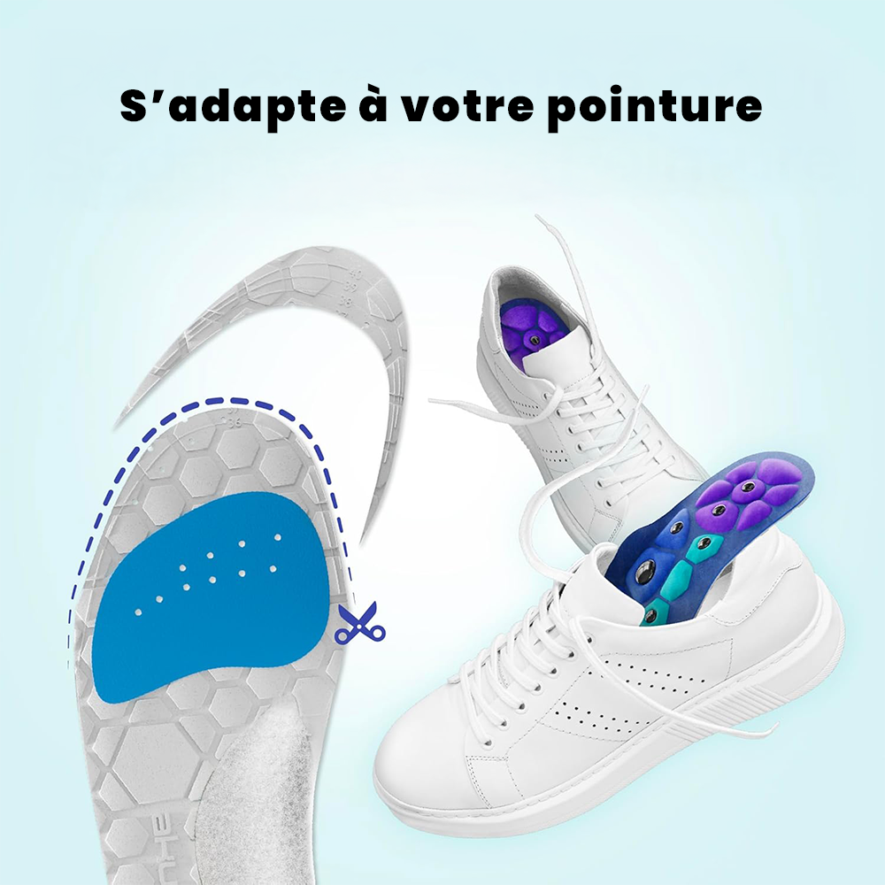 Adaptée à toutes les pointures et tous types de chaussures (baskets, chaussures de ville, travail, sport…), la semelle se découpe facilement pour s’ajuster à votre taille. Son design en nid d’abeille respirant garde vos pieds au sec, tandis que les aimants discrets travaillent pour votre bien-être.
